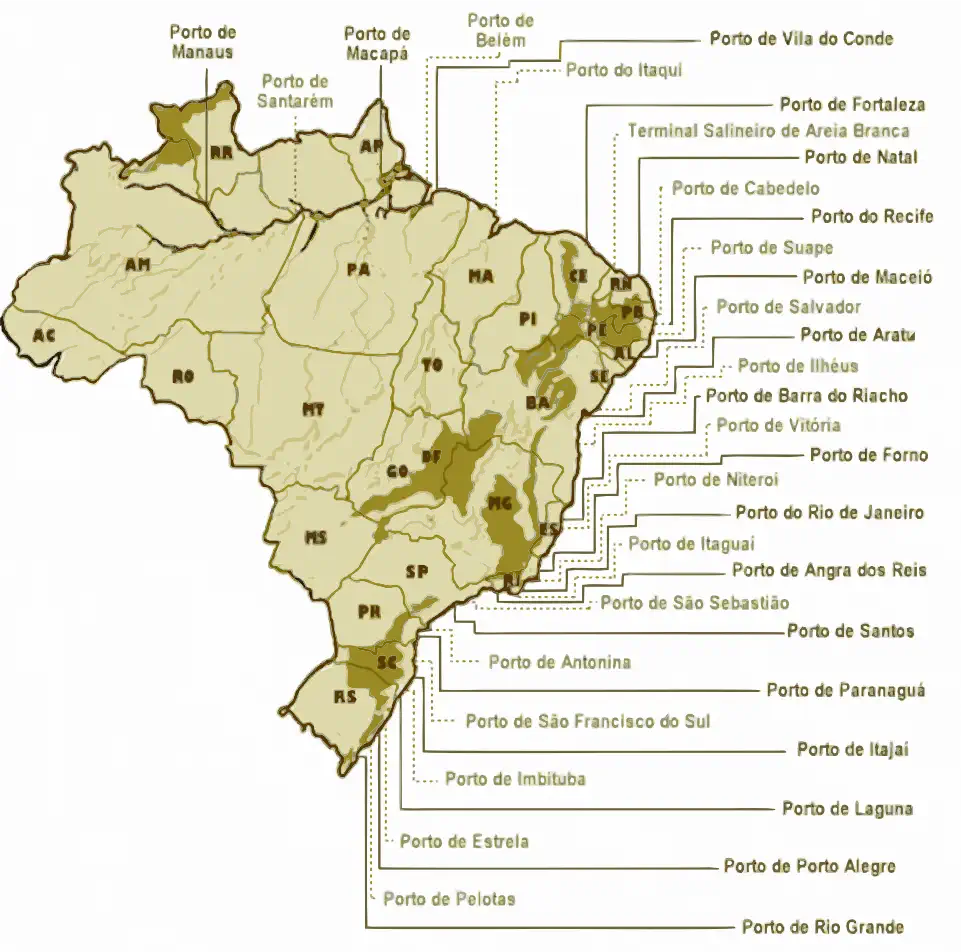 São Paulo, Rio de Janeiro, Vitória, Salvador, Fortaleza, Rio Grande, Santos, São Luís, Belém, Manaus, Recife, Paranaguá, Imbituba, Itajaí, São Francisco do Sul and Porto Alegre.